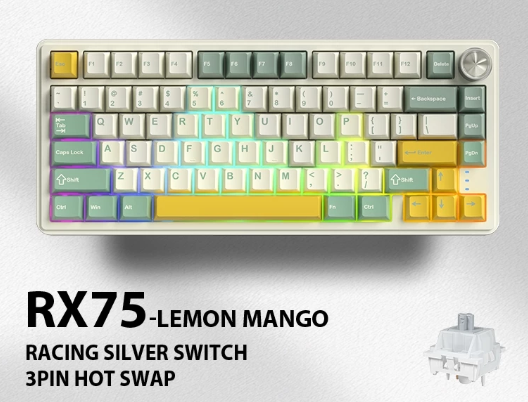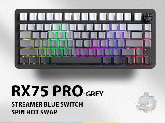 RX75 PRO is a 75% hot-swappable mechanical keyboard featuring 80-82 keys, a gasket-mounted structure, and tri-mode connectivity (Bluetooth 5.0, 2.4G, Wired). It includes a metal volume knob, RGB lighting, and pre-lubed switches (e.g., TNT/Panda/Flow Blue) for a “thocky” sound. It is ideal for gaming and typing, offering 5-side dye-sub PBT keycaps.